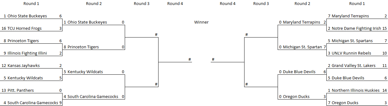 jytreberg wrote:I was holding off posting an updated bracket for a bit, but it looks like all series are decided at this point even though the Kentucky/South Carolina match-up still hasn't finished enough games, there is at least one firm win for Kentucky to take the series and give us our first upset of the bracket stage.